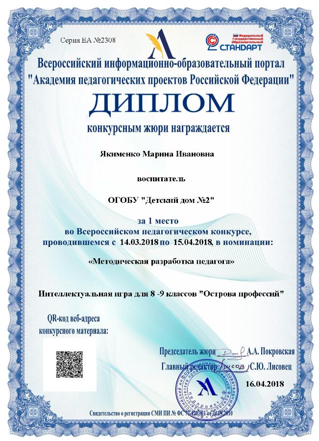 2018 год, областное государственное автономное образовательное учреждение дополнительного профессионального образования «Институт повышения квалификации педагогических работников», повышение квалификации по программе «Психолого-педагогические основы деятельности детских домов и школ-интернатов» (72 ч.)